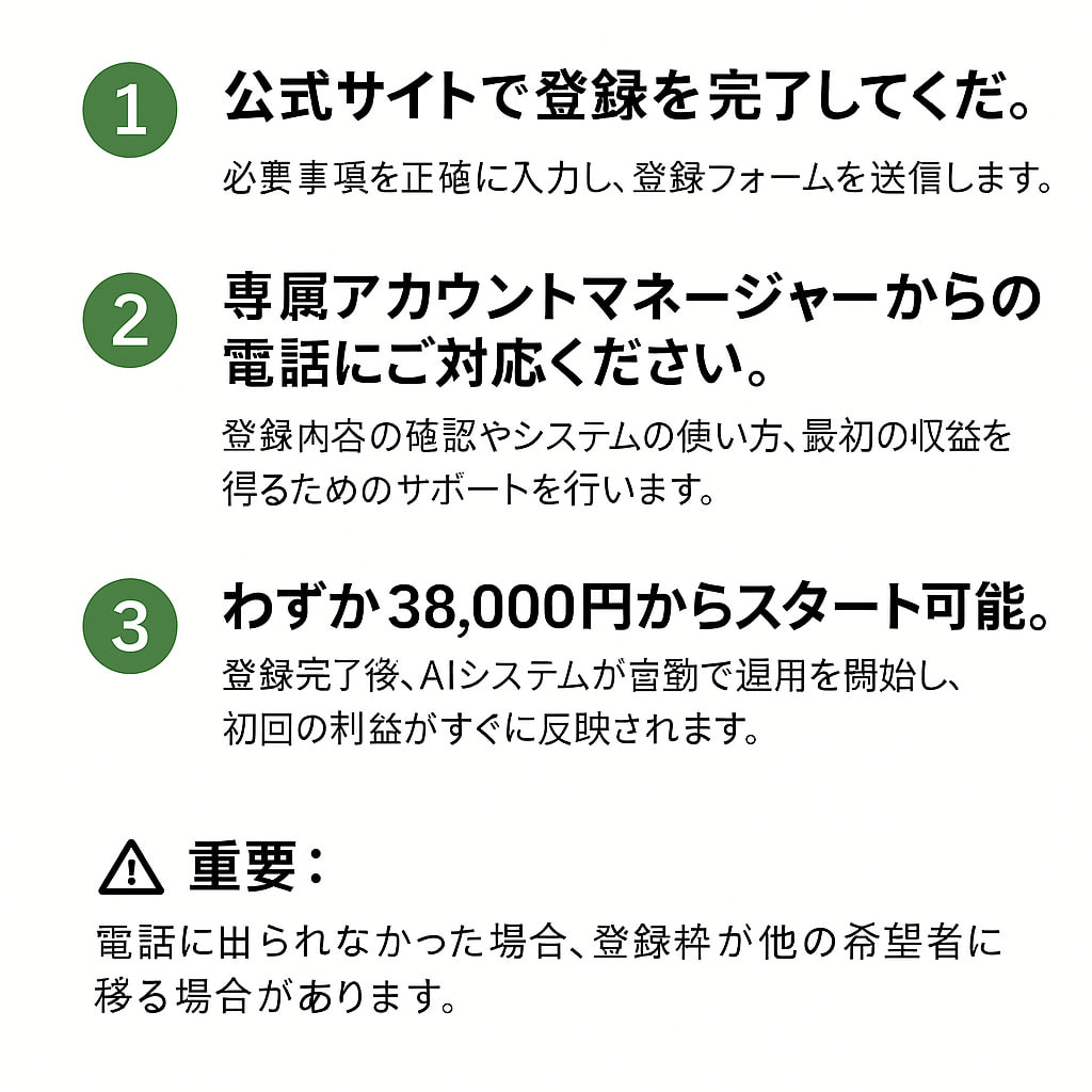 「Senvix」は、ユーザーが利益を得たときにのみ運営側にも収益が発生する公平な仕組みで す。 わずか38,000円から始められ、複雑な手続きやリスクはありません。 サポートチームは24時間365日対応しており、質問や不安があればいつでも電話で相談可能 です。 その安心感から、多くの日本人が「Senvix」を選んでいます。